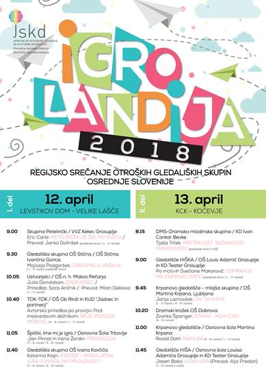 Vabljeni na regijsko srečanje otroških gledaliških skupin Igrolandija 2018, ki bo 12. aprila 2018 v Levstikovem domu v Velikih Laščah, 13. aprila pa v KCK Kočevje. Srečanje organizirata Ribniška in Kočevska izpostava Javnega sklada RS za kulturne dejavnosti. Program je v prilogi. Plakat igrolandija 2018 (pdf 475kb)